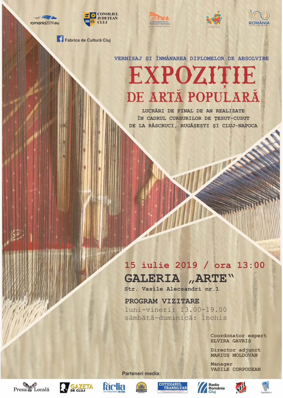 Expoziţia – al cărei vernisaj va începe la ora 13.00 – cuprinde lucrările de diplomă şi final de an realizate în cadrul cursurilor de ţesut-cusut de la Răscruci, Rugăşeşti şi Cluj-Napoca, ale cursantelor Şcolii de Arte Cluj. „Tema abordată este confecţionarea unor obiecte tradiţionale, care se utilizează în împodobirea locuinţelor: şervete, feţe de masă, perne, ştergare – dar şi obiecte de vestimentaţie precum iia. Expoziţia mai cuprinde şi lucrări realizate în cadrul cursului intensiv din luna mai 2019, piese care mi s-au părut potrivite pentru a face parte din expoziţie”, ne-a declarat d-na Elvira Gavriş, organizatorul expoziţiei, expertul claselor de ţesut-cusut ale Şcolii de Arte Cluj. Menţionăm că la evenimentul din 15 iulie 2019 vor fi înmânate şi diplomele de absolvire pentru douăzeci şi unu de cursante din Cluj-Napoca şi Rugăşeşti. În ceea ce priveşte programul de vizitare a expoziţiei, acesta este următorul: de luni până vineri, între orele 13.00 – 19.00, pe tot parcursul verii, excepție făcând luna august.