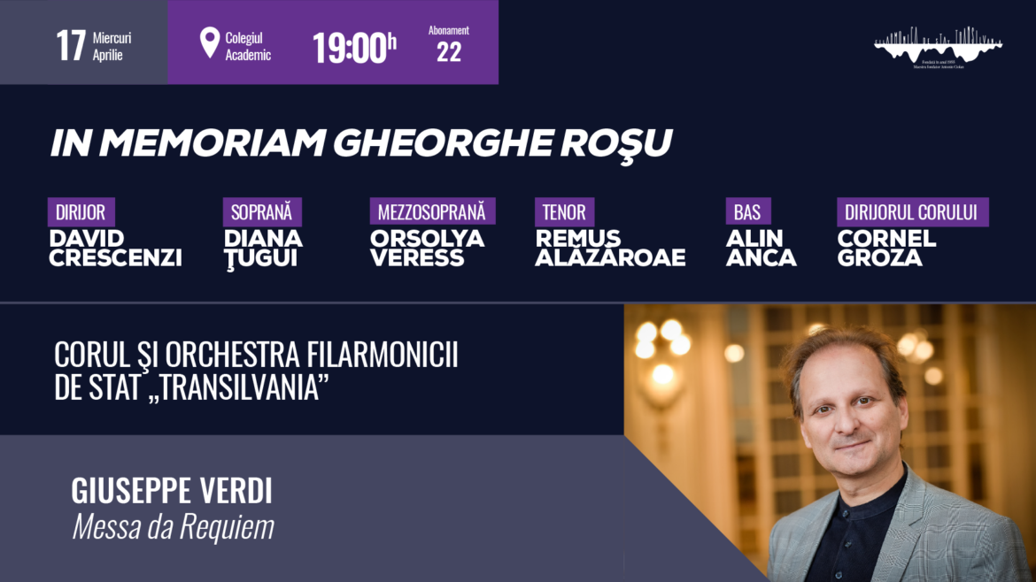 Filarmonica de Stat ,,Transilvania” invită publicul clujean miercuri, 17 aprilie, de la ora 19, la un concert-eveniment care vine în întâmpinarea Paștilor Catolice: Messa de Requiem de Verdi, dirijat de David Crescenzi. Un concert tulburător, unde, alături de Corul și de Orchesta Filarmonicii, vor urca pe scenă soliștii Diana Ţugui (soprană), Orsolya Veress (mezzosoprană), Remus Alăzăroae (tenor), Alin Anca (bas).