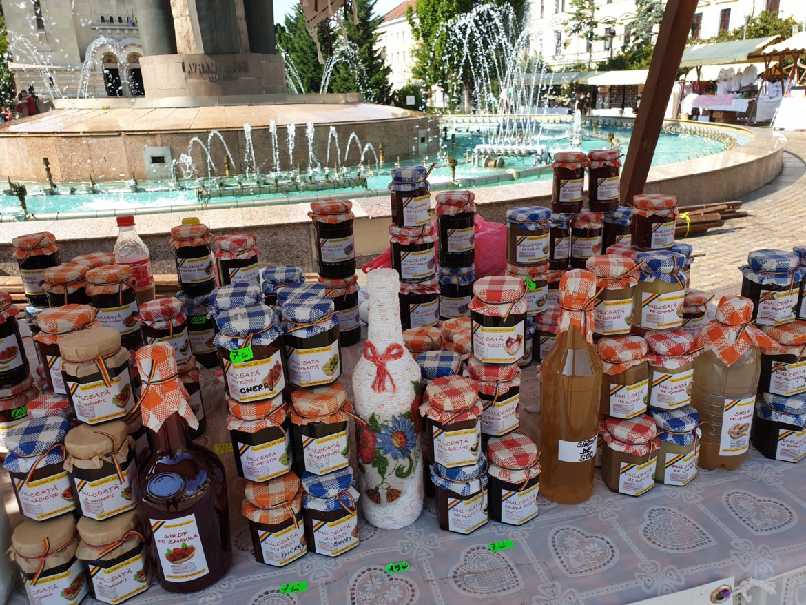 ”Noi realizăm dulcețuri în cantități mici, în jur de 2-3 kg maxim la o porție. Practic nu avem o fabrică, noi producem dulceața așa cum se făcea pe vremuri, la bunica în casă. Soția face peste 100 de feluri, dar nu le avem pe toate expuse acum, pentru că depinde de sezon. De exemplu, avem dulceața de ardei iuți sau cea de usturoi, care se pot face în orice sezon. În schimb, dulceața de caise se poate face doar când se coc caisele, dulceața de căpșuni este cea mai bună în perioada lor de vânzare, primăvara, începutul verii. Zmeura acum începe să se coacă, avem zmeură chiar în grădină. Suntem într-o zonă cu afine, merișoare, mure, în zona Apuseni, comuna Băișoara. Merg împreună cu soția să le culegem”, povestește producătorul, Emil Gârbovan.
