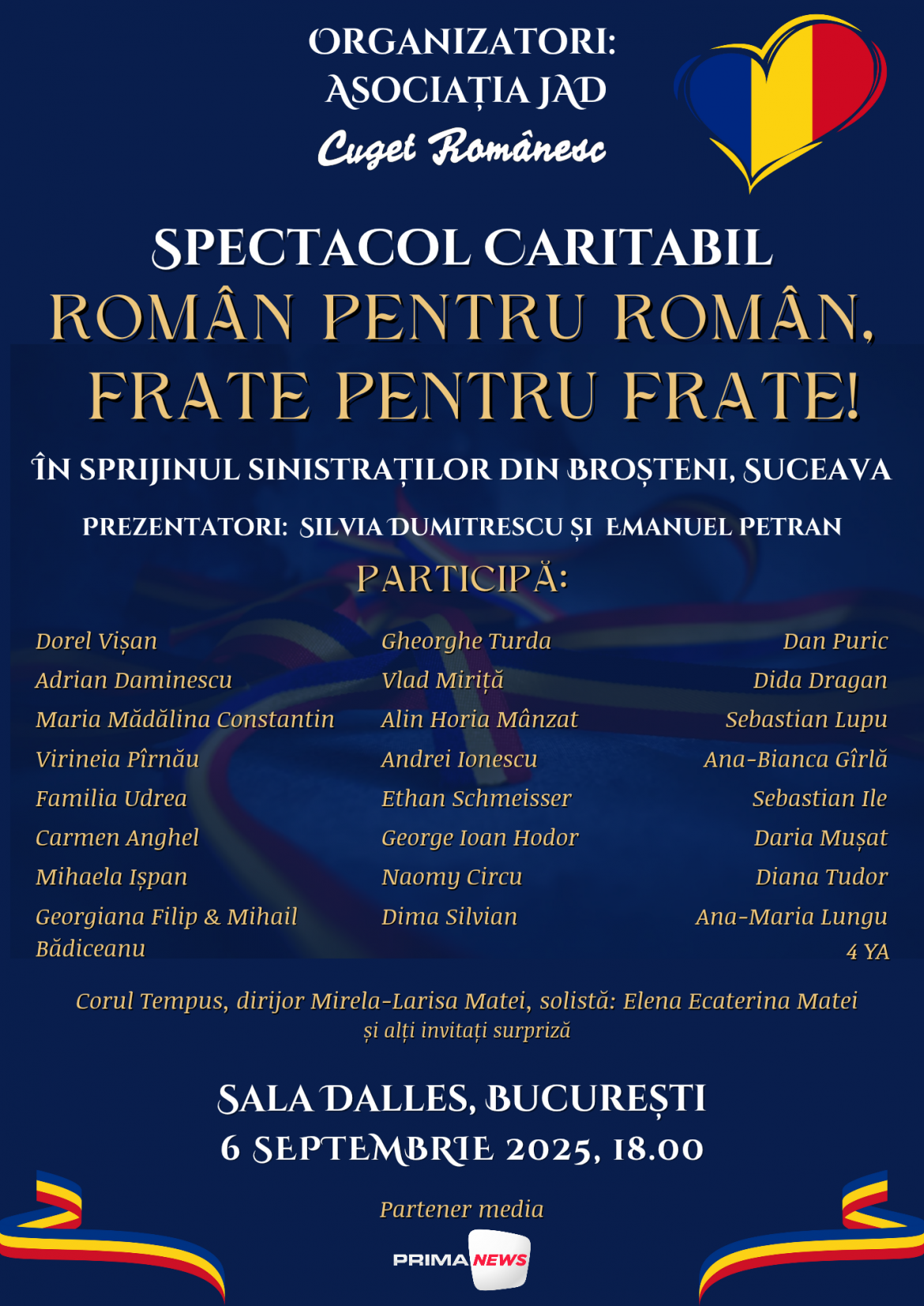 Sâmbătă, 6 septembrie, de la ora 18.00, Sala Dalles din București devine locul unde muzica, teatrul și dansul se unesc pentru a aduce speranță. Un spectacol caritabil cu peste 40 de artiști consacrați și tineri talentați este organizat pentru a sprijini oamenii din Broșteni, județul Suceava, grav afectați de inundații.
