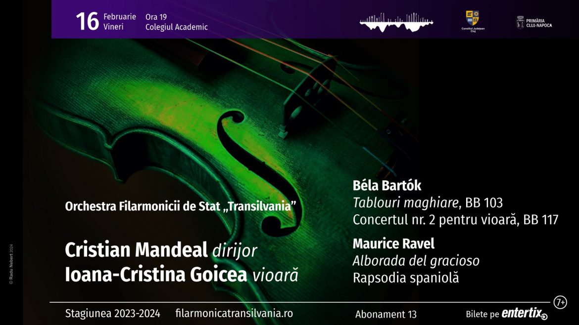Dirijorul principal al Filarmonicii de Stat „Transilvania”, Maestrul Cristian Mandeal, va dirija, vineri, 16 februarie 2024, ora 19.00, Béla Bartók și Maurice Ravel, în interpretarea Orchestrei Filarmonicii de Stat „Transilvania”, căreia i se va alătura și violonista Ioana-Cristina Goicea.