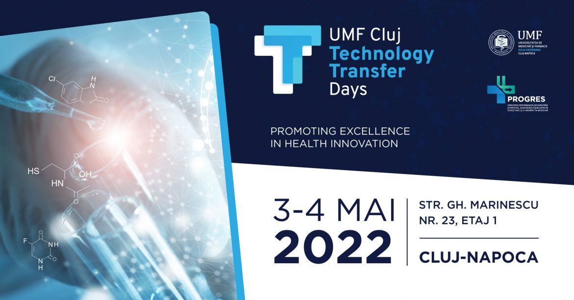 Universitatea de Medicină și Farmacie „Iuliu Hațieganu” Cluj-Napoca va organiza, în perioada 3-4 mai 2022, prima ediție a UMF Cluj Technology Transfer Days. În cele două zile ale evenimentului vor fi prezentate rezultate ale cercetării desfășurate în cadrul universității, sub formă de brevete de invenție sau cereri de brevet de invenție, precum și serviciile oferite de cele două centre de cercetare care funcționează în cadrul UMF: Centrul de Cercetări pentru Medicină Avansată – MedFUTURE și Centrul de Cercetări pentru Genomică Funcțională, Biomedicină și Medicină Translațională – Genomic Center. De asemenea, cei interesați vor putea vizita cele două centrele de cercetare.