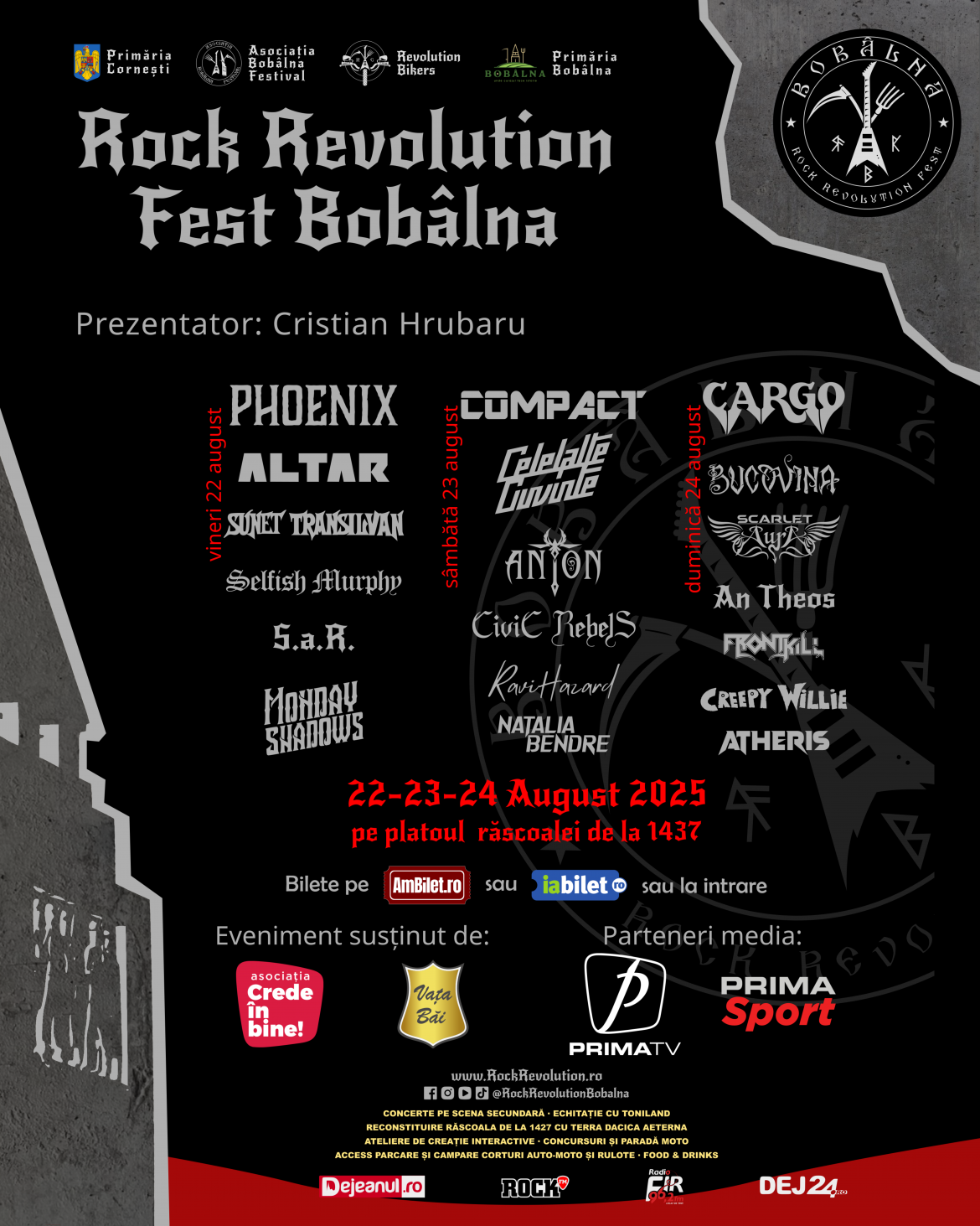 Pe scena festivalului vor urca: Phoenix, Altar, Cargo, Compact, Celelalte Cuvinte, Bucovina și multe alte nume care vor face scena să vibreze! Verifică afișul pentru mai multe detalii și începe să-ți pregătești vocea pentru cântecele preferate! Va fi un festival de legendă! Ne vedem acolo, fani rock!