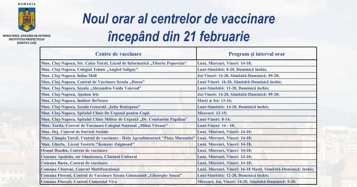 În urma diminuării fluxului de vaccinare la unele din centre sau chiar închiderea altora nu mai mult de 20 de centre de vaccinare sunt astăzi disponibile la nivelul județului dintre care 14 se află în Cluj-Napoca iar începând de astăzi acestea vor funcționa după un nou orar potrivit căruia majoritatea nu vor avea și program de weekend.