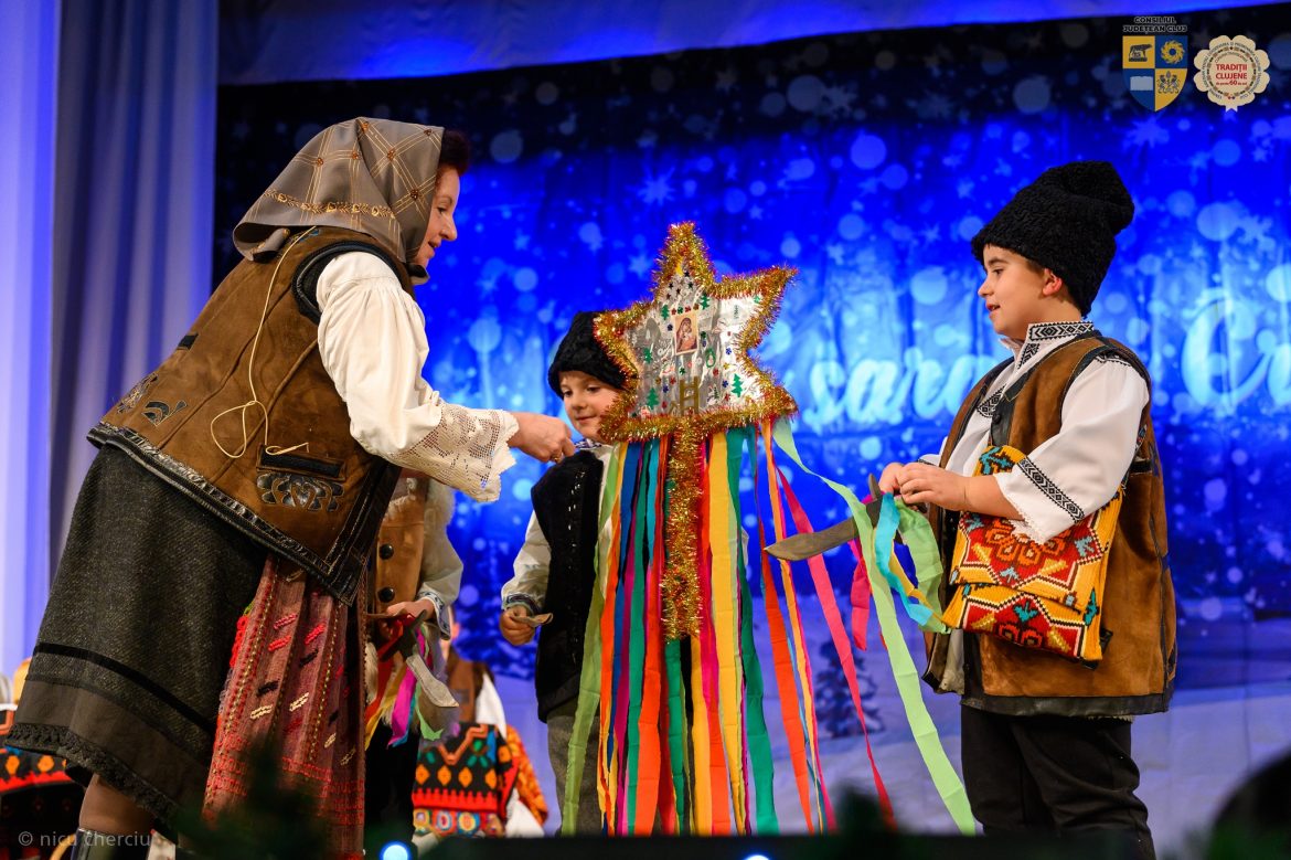 Foto: Copii cu steaua – colindători din cadrul grupului „Tradiții ormănene” din Orman, jud. Cluj, coord. Aurora Cosma/în cadrul spectacolului extraordinar de colinde și obiceiuri de iarnă „Bună sala lui Crăciun!” 2024