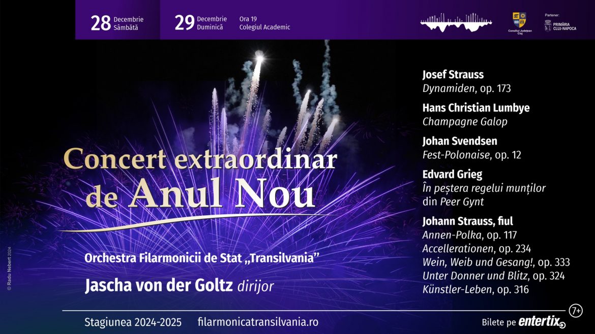 Acesta va fi susținut de către Orchestra Filarmonicii de Stat „Transilvania” sub bagheta 🪄 dirijorului Jascha von der Goltz în zilele de 28 și 29 decembrie 2024, cu începere de la orele 19.00 la Colegiul Academic.