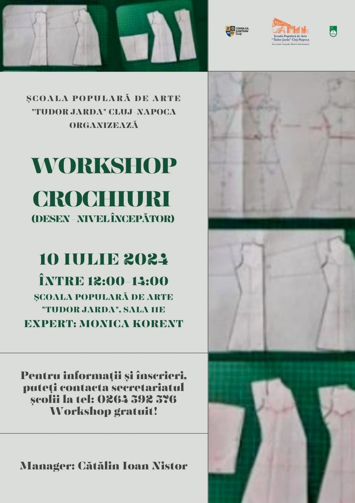Activitățile vor avea loc miercuri, 10 iulie, între orele 12.00 – 14.00. Cursul de vară denumit „Bazele artelor decorative” se adresează tuturor celor care doresc să învețe sau să aprofundeze metodele de lucru în decoratiuni, compoziții, culori și stiluri în artele decorative. Workshop-ul de crochiuri de modă se adresează persoanelor care doresc să învețe bazele desenului de crochiul de modă. Pentru informații și înscrieri, puteți contacta secretariatul Școlii Populare de Arte „Tudor Jarda” la numărul de telefon 0264 592 576.