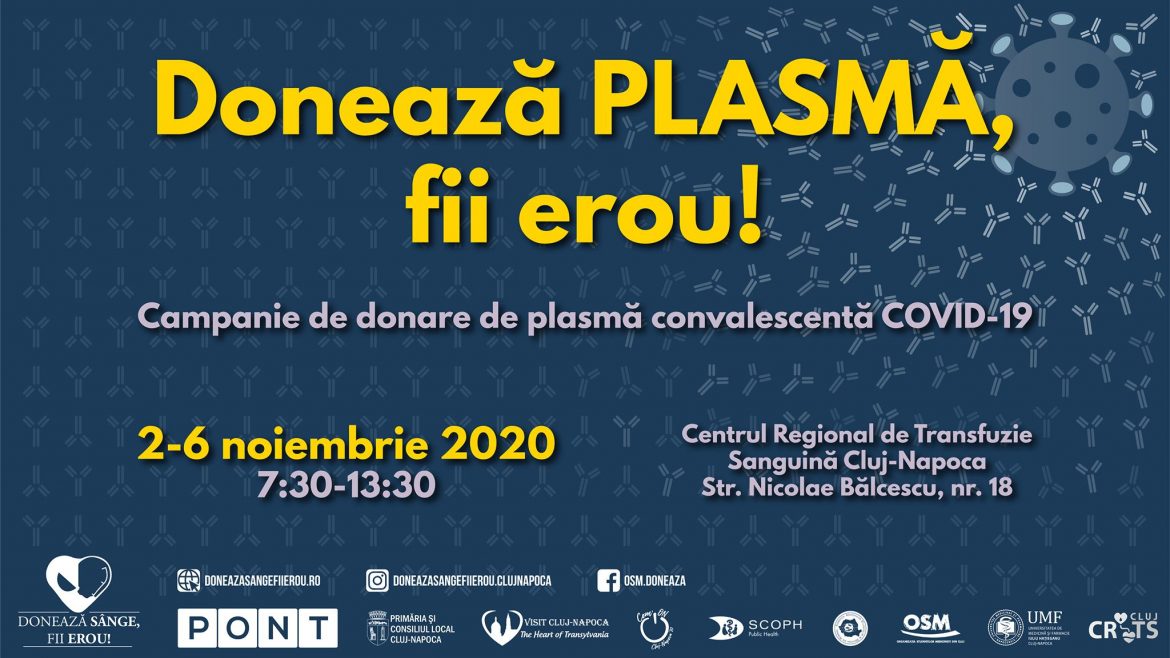 Donează sânge, fii erou! Cluj-Napoca organizează în perioada 2-6 noiembrie 2020 campania de donare de plasmă convalescentă COVID-19 “Donează PLASMĂ, fii erou” în parteneriat cu Centrul Regional de Transfuzie Sanguină Cluj-Napoca.
