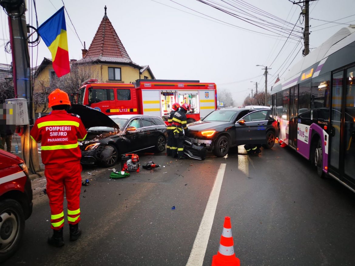 La fața locului au fost găsite două autoturisme avariate cu ocupanții ieșiți din acestea. Două persoane au fost consultate de către echipajul SMURD, dintre care o femeie a fost transportată la spital pentru îngrijiri medicale, au transmis pompierii clujeni.