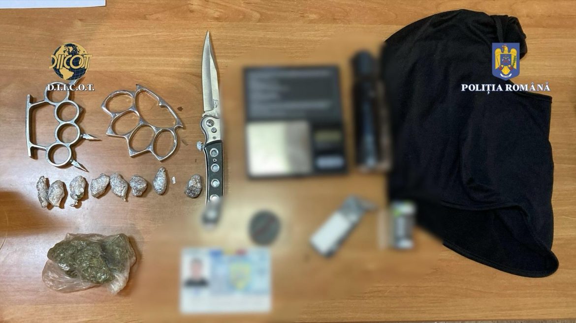 Totodată, asupra acestuia au mai fost găsite un cântar electronic, două pumnale, un spray iritant lacrimogen, un briceag și o cagulă.