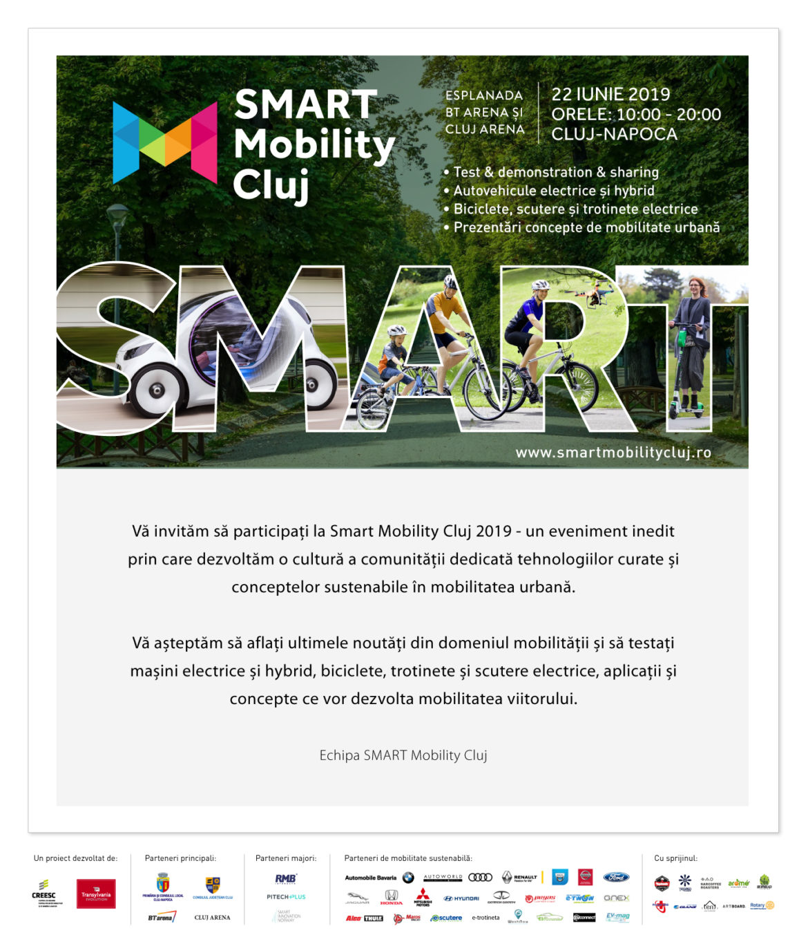 Smart Mobility Cluj este organizat de Centrul de Resurse pentru Eficiență Energetică și Schimbări Climatice (CREESC) și Transylvania Evolution, cu sprijinul Primăriei Cluj-Napoca și al Consiliului Județean Cluj. Evenimentul va avea loc sâmbătă, între orele 10:00- 20:00, pe esplanada BT Arena & Cluj Arena. Accesul la eveniment este gratuit.