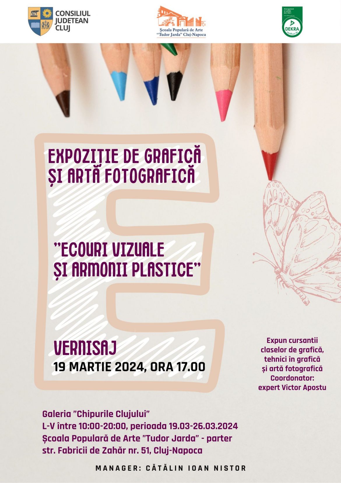 Scoala Populară de Arte „Tudor Jarda” Cluj-Napoca – instituție subordonată Consiliului Județean Cluj invită publicul să se alăture unei călătorii captivante în lumea artei contemporane, prin intermediul expoziției de grafică și artă fotografică. Aceasta va fi găzduită în perioada 19-26 martie 2024, la Galeria de artă ”Chipurile Clujului”, situată la parterul școlii, pe str. Fabricii de Zahăr nr. 51.
