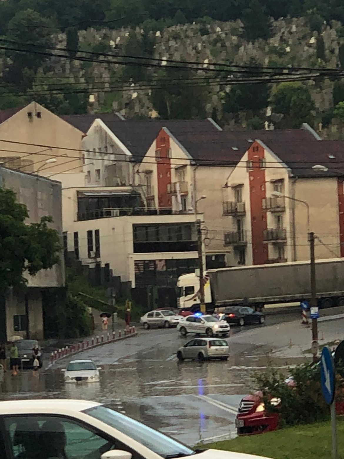 Varianta Zorilor- Mănăștur a fost blocată total, după ce apa a intrat pe carosabil. Unele mașini au fost surprinse de șuvoaie și nu au mai putut înainta.