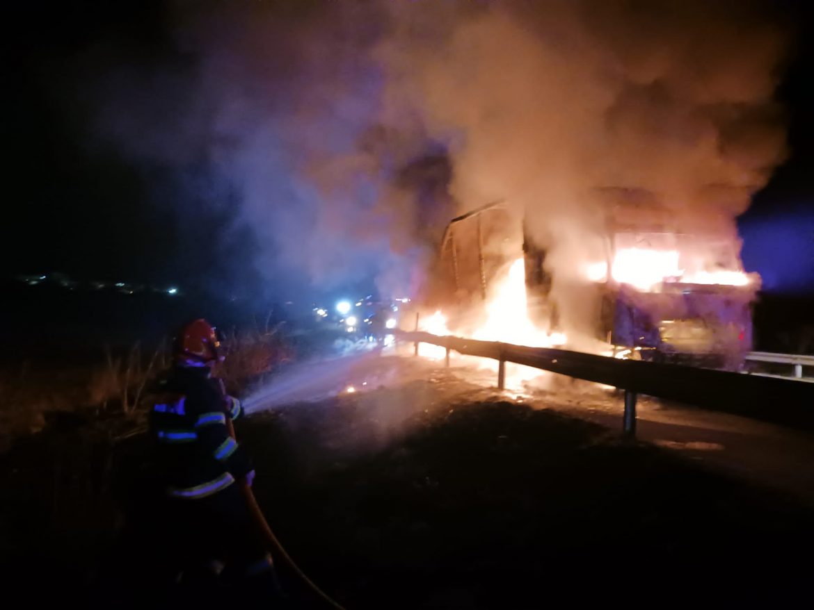 La fața locului au intervenit două autospeciale pentru stingerea incendiilor, unde a fost găsit autocamionul, inclusiv rezervorul de carburant, și încărcătura acestuia, respectiv materiale din polistiren, arzând generalizat.