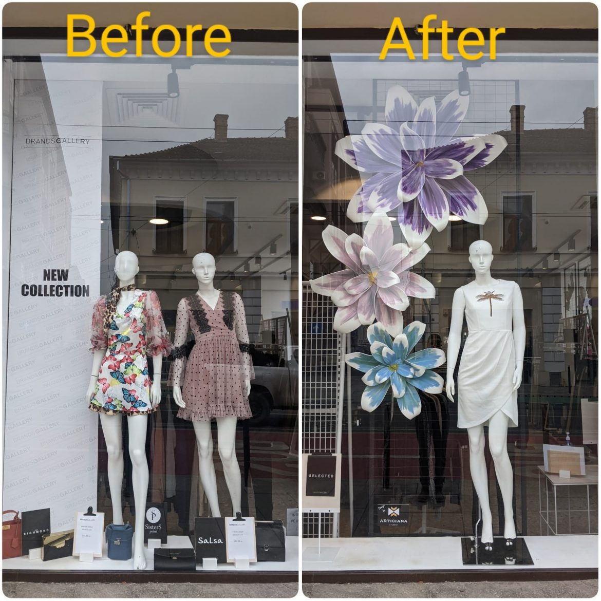 “Eu am încercat să creez un concept unitar. Pe strada Regele Ferdinand există trei magazine unde am schimbat design-ul după ce am primit solicitări. Într-una dintre vitrine sunt trei flori care au culori de primăvară, iar în celelalte două sunt petale. La sfârșitul săptămânii vom mai reuși să schimbăm design-ul la încă două magazine. Oamenii au fost mirați de ceea ce au văzut, practic i-a atras să intre în acele magazine. Rochiile din vitrină s-au vândut chiar în prima zi”, explică designerul Andreea Ghișa.