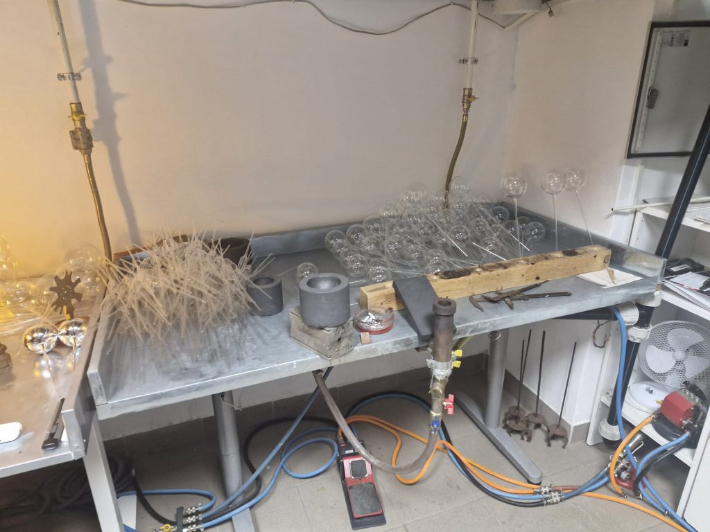 Globurile de sticlă sunt rezultatele unui proces laborios, împărțit în mai multe etape ce necesită implicare manuală. Întâi de toate, sticla este încălzită și suflată manual pentru a fi dimensionată iar formele rezultate sunt ulterior supuse procesului de argintare. Globurile sunt umplute cu o soluție de argint și agitate iar mai apoi sunt scufundate în apă fierbinte. În urma argintării, acestea sunt lăsate să se scurgă, este foarte important ca ele să fie uscate pe dinăuntru înainte să fie vopsite. După aplicarea vopselii, globurile sunt lăsate la uscat 30 de minute ca mai apoi să poată fi personalizate fie prin pictură manuală fie prin aplicarea foițelor de aur în funcție de comandă. Ulterior, globurile realizate sunt ambalate folosind cutii de carton.