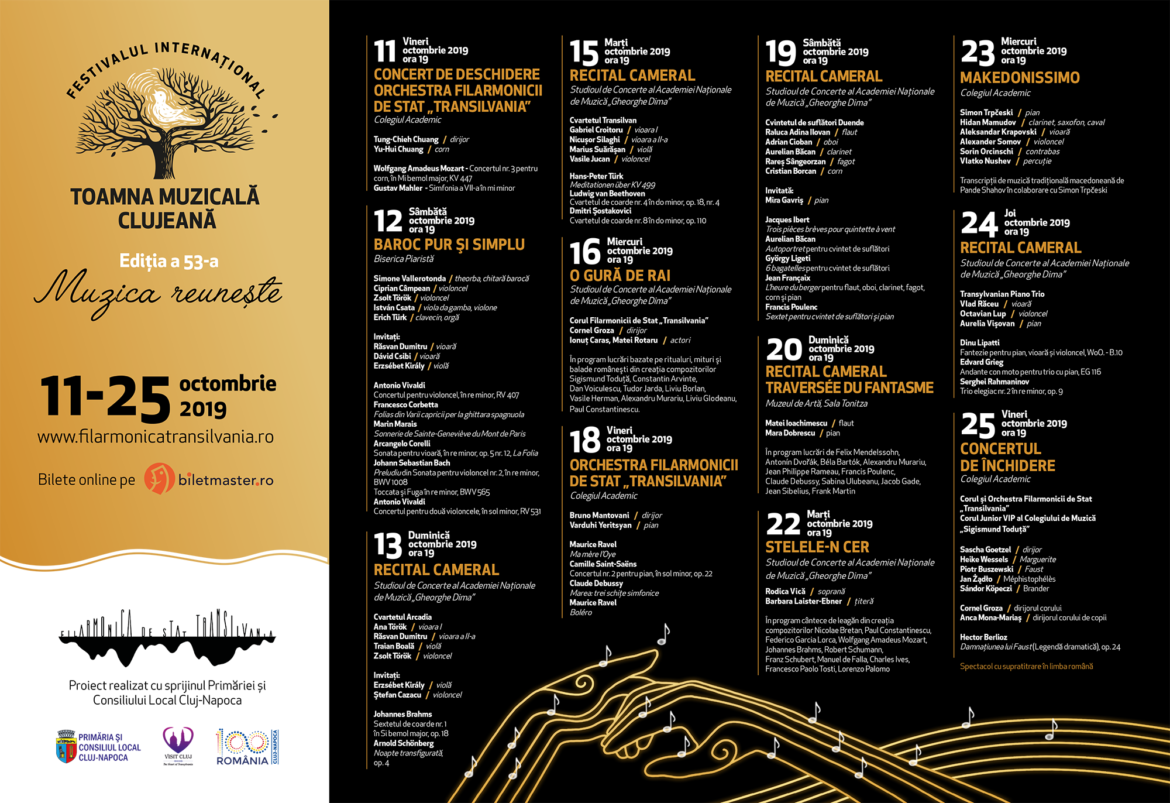Cel mai vechi festival de muzică din țară, Toamna Muzicală Clujeană, organizat de filarmonica de stat ”Transilvania” din Cluj-Napoca, incepe peste câteva zile. Evenimentul ajuns la a 53-a ediție va avea loc între 11 și 25 octombrie. ”Este cel mai important eveniment de acest gen din regiune și cel mai vechi festival de muzică clasică din România”, spun organizatorii.