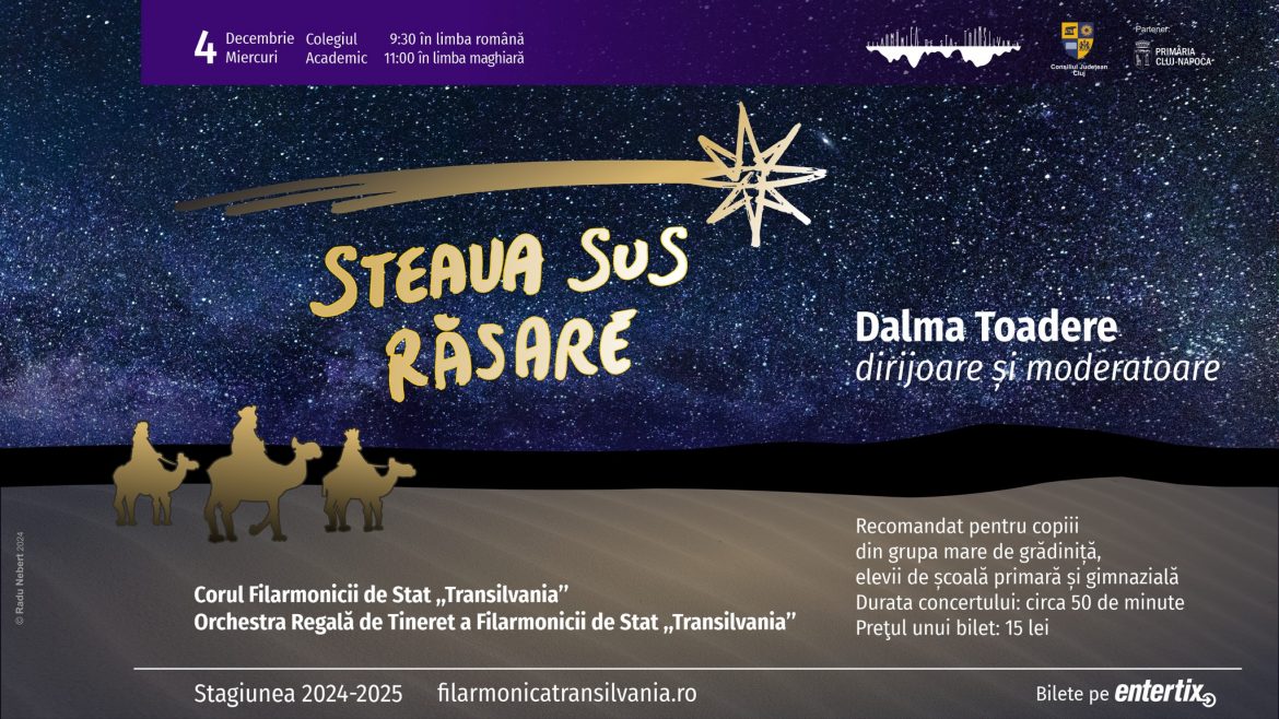 Steaua sus răsare este concertul de Crăciun dedicat copiilor, iar pe scena sălii Auditorium Maximum membrii Corului Filarmonicii de Stat ,,Transilvania’’ și ai Orchestrei Regale de Tineret a Filarmonicii de Stat ,,Transilvania’’ sub bagheta dirijoarei Dalma Toadere, le vor oferi copiilor două spectacole în limba română, respectiv în limba maghiară, cu începere de la orele 9.30 și 11.00.