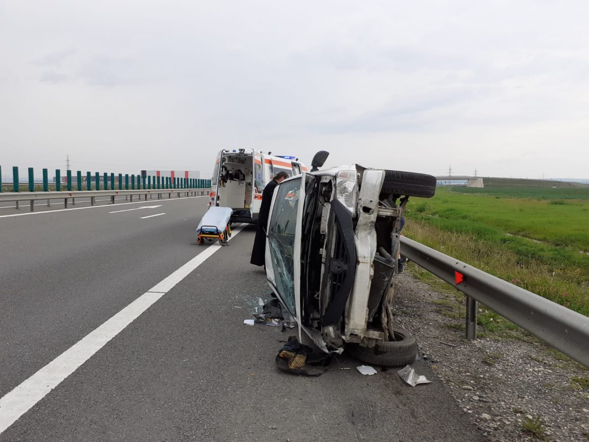 O mașină s-a răsturnat sâmbătă după-amiaza pe Autostrada A10 Sebeș- Turda. În urma accidentului, un bătrân în vârstă de 90 de ani a fost rănit și a fost transportat de urgență la spital.