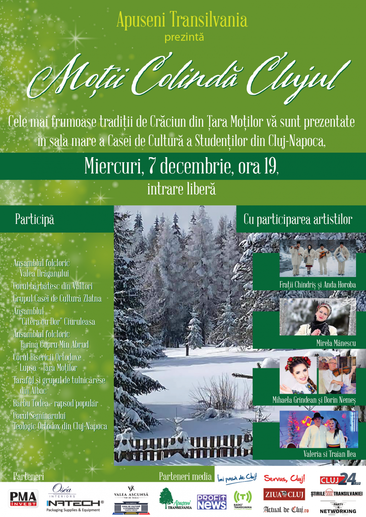 Cele mai frumoase tradiții de Crăciun din Țara Moților le sunt prezentate clujenilor miercuri, 7 decembrie, la Casa de Cultură a Studenților. Evenimentul, organizat de Asociația Apuseni Transilvania, începe la ora 19.00, iar intrarea este liberă.
