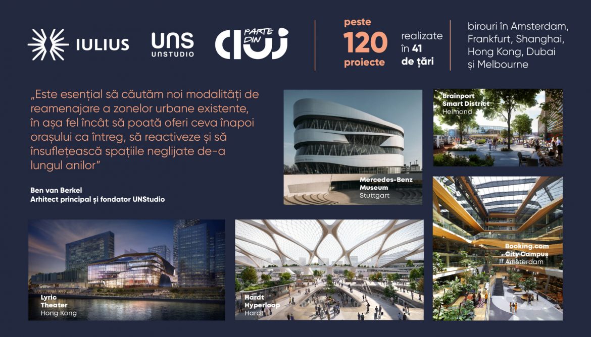Muzeul Mercedes-Benz din Stuttgart, ansamblul multifuncțional Four Frankfurt, conceptul unic și sustenabil Brainport Smart District din Helmond, Lyric Theatre Complex din Hong Kong, Arnhem Central Station, Doha Metro, Erasmus Bridge din Rotterdam sunt doar câteva exemple dintre cele 120 de proiecte pe care UNStudio le-a realizat în întreaga lume. Lor li se alătură primul obiectiv realizat în România din portofoliul renumiților arhitecți: reconversia platformei Carbochim într-o Parte din Cluj, investiție a grupului IULIUS.
