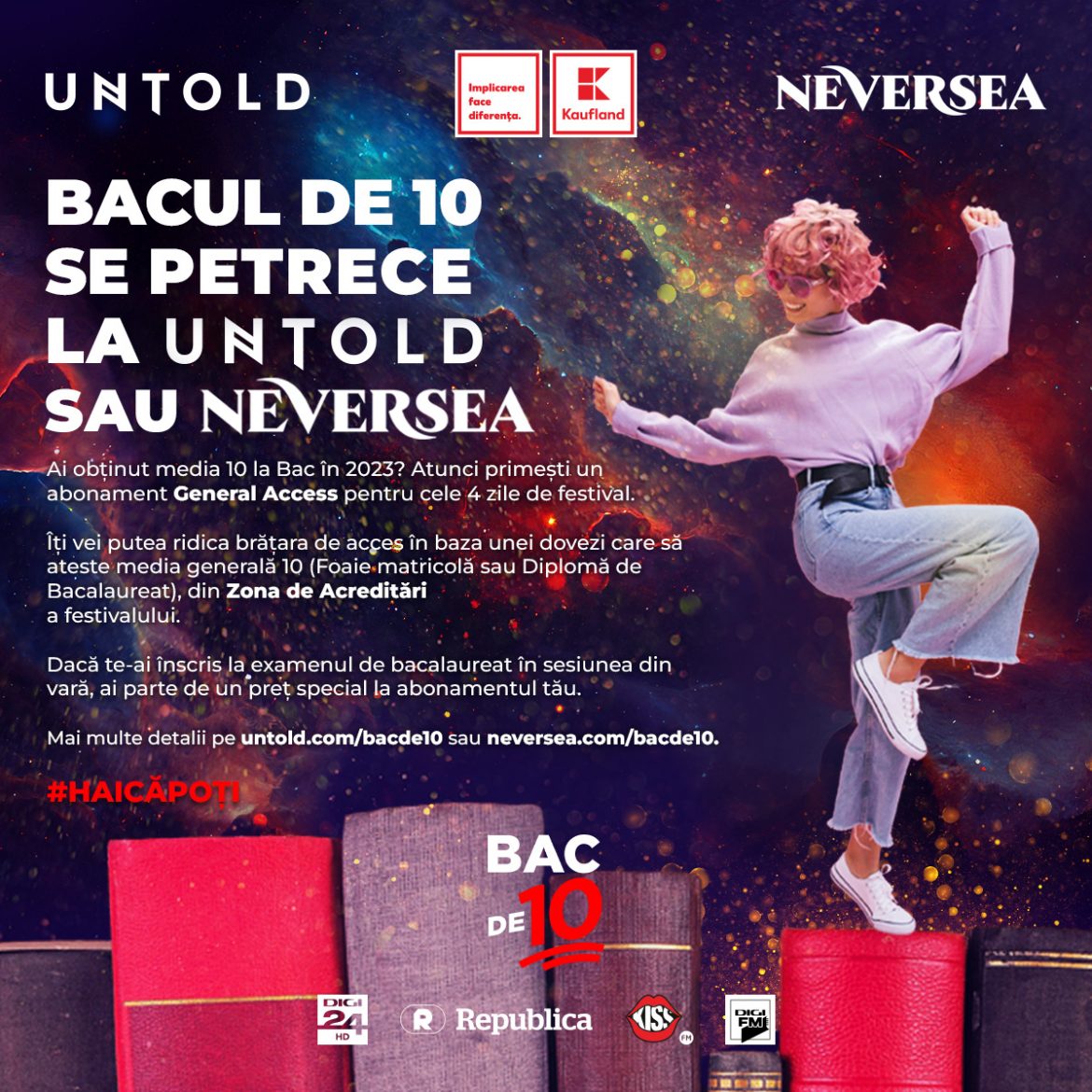 Organizatorii UNTOLD și Neversea sunt alături de elevii de 10 ai României într-o nouă inițiativa “BAC DE 10”. Performanța elevilor de 10 va fi recompensată cu experiențe memorabile și anul acesta.