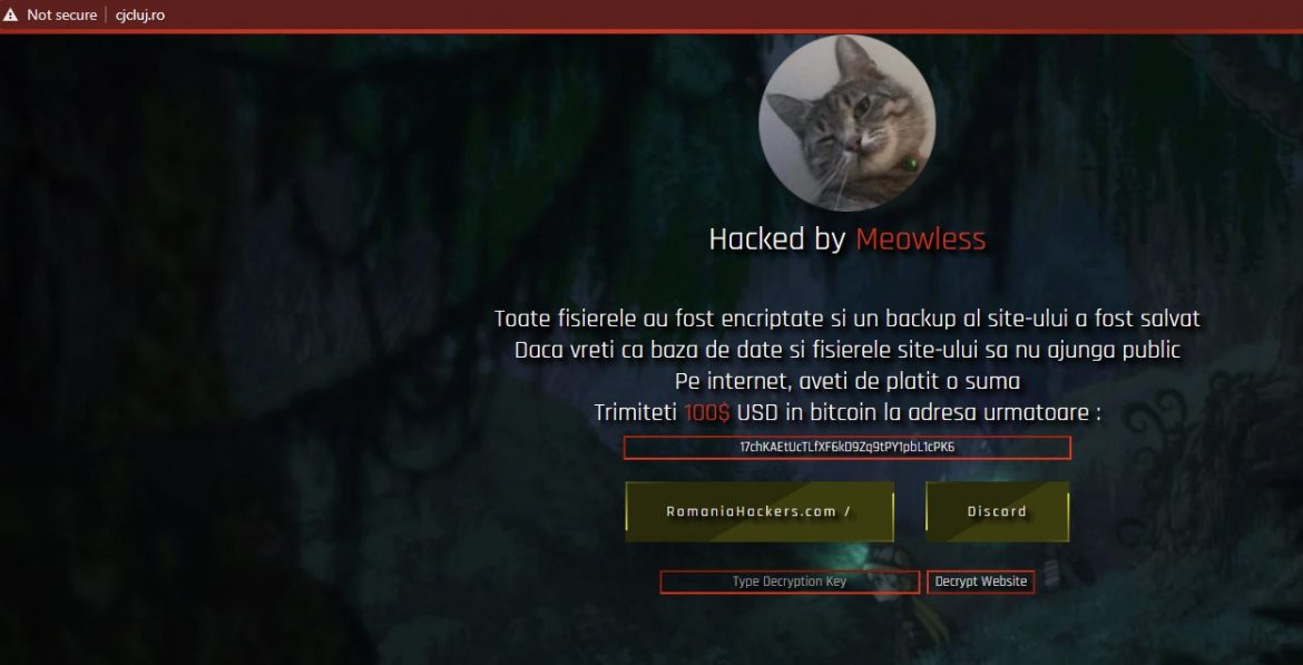 Hackerii au reușit să spargă joia trecută site-ul Consiliului Județean Cluj. Aceștia cer forului județean o răscumpărare de 100 de dolari, plătită într-o monedă virtuală, pentru a nu publica baza de date sau alte informații confidențiale.