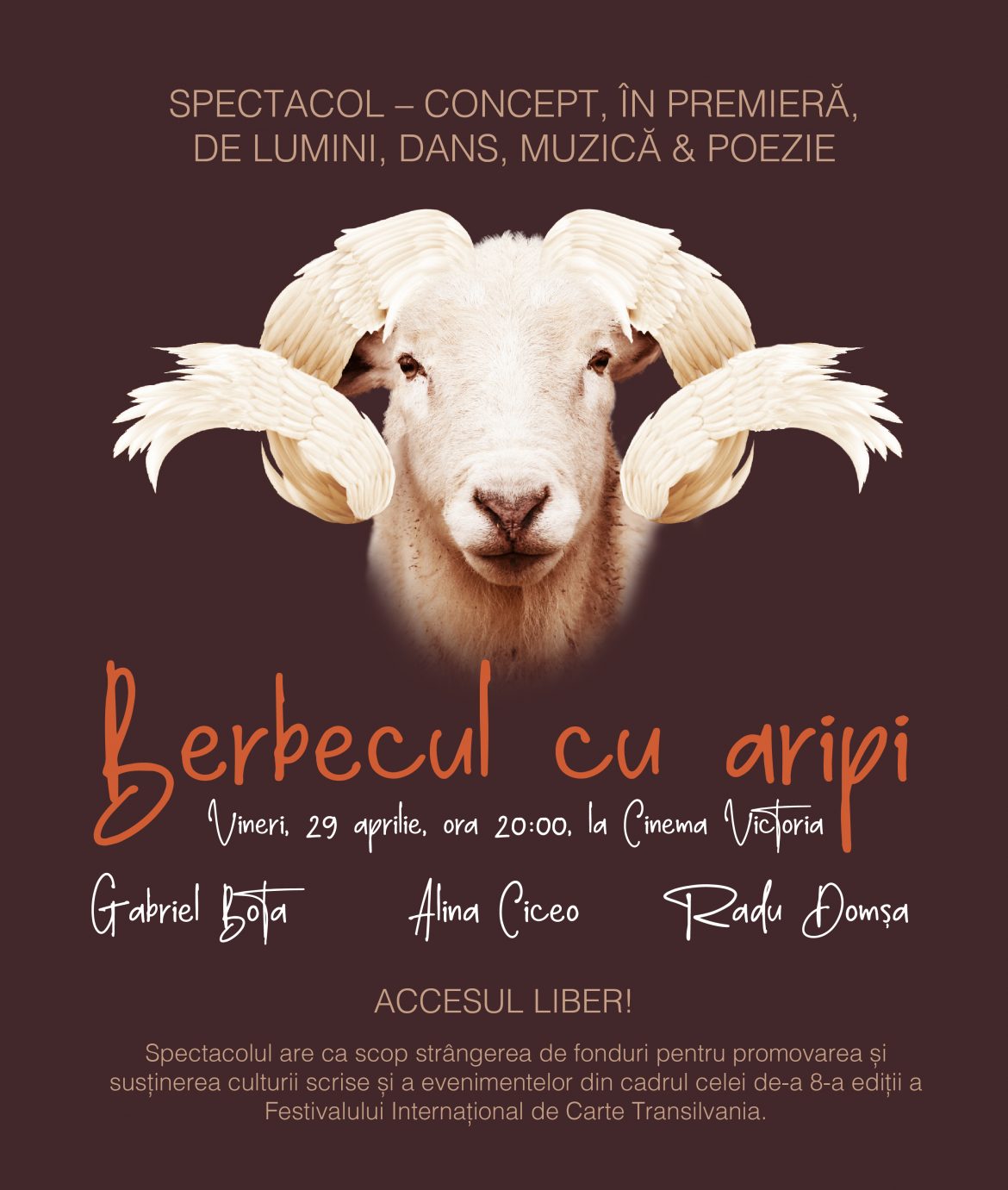 Festivalul Internațional de Carte Transilvania (FICT) organizează vineri, 29 aprilie, ora 20:00, la Cinema Victoria, evenimentul „Berbecul cu aripi”: un spectacol de lumini magice, dans contemporan, muzică și poezie!