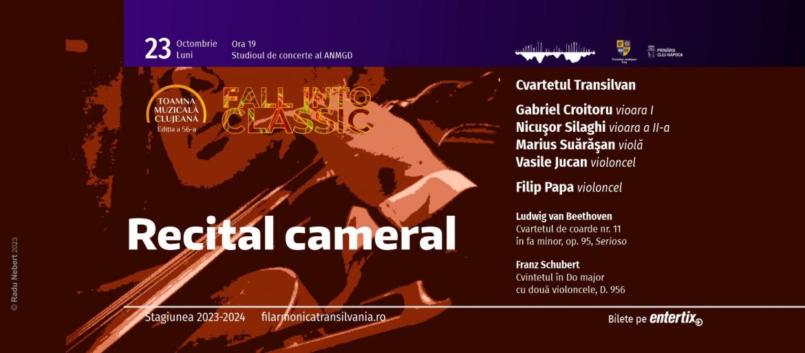 Astfel, luni, 23 octombrie 2023, ora 19.00 vor urca pe scena studioului de concerte al Academiei clujene de muzică, Cvartetul Transilvan alături de violoncelistul Filip Papa. Melomanii vor putea audia lucrări semnate de Ludwig van Beethoven – Cvartetul de coarde nr. 11 în fa minor, op. 95, Serioso și Franz Schubert Cvintetul în Do major cu două violoncele, D. 956.