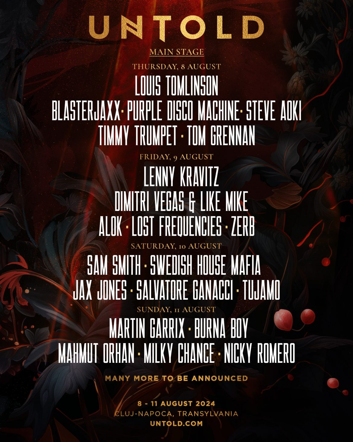 Alături de aceștia, în această vară, pe scena principală a festivalului UNTOLD vor ajunge: legenda rock Lenny Kravitz, britanicul Sam Smith, Burna Boy, trio-ul Swedish House Mafia, Martin Garrix, duo-ul Dimitri Vegas & Like Mike, brazilianul Alok, Timmy Trumpet, Lost Frequencies și Purple Disco Machine.