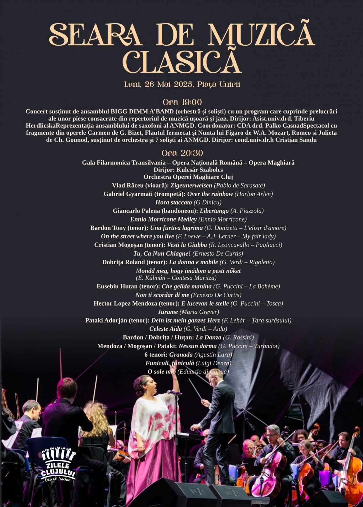 Sărbătoarea orașului continuă și astăzi, 26 mai, cu una dintre cele mai elegante și emoționante seri ale ediției – seara de muzică clasică. De la ora 19:00, Piața Unirii devine scenă pentru un regal sonor oferit de Academia Națională de Muzică „Gheorghe Dima”, soliștii Operei Naționale Române din Cluj-Napoca, ai Operei Maghiare de Stat și ai Filarmonicii de Stat Transilvania, acompaniați de orchestra Operei Maghiare de Stat din Cluj-Napoca.