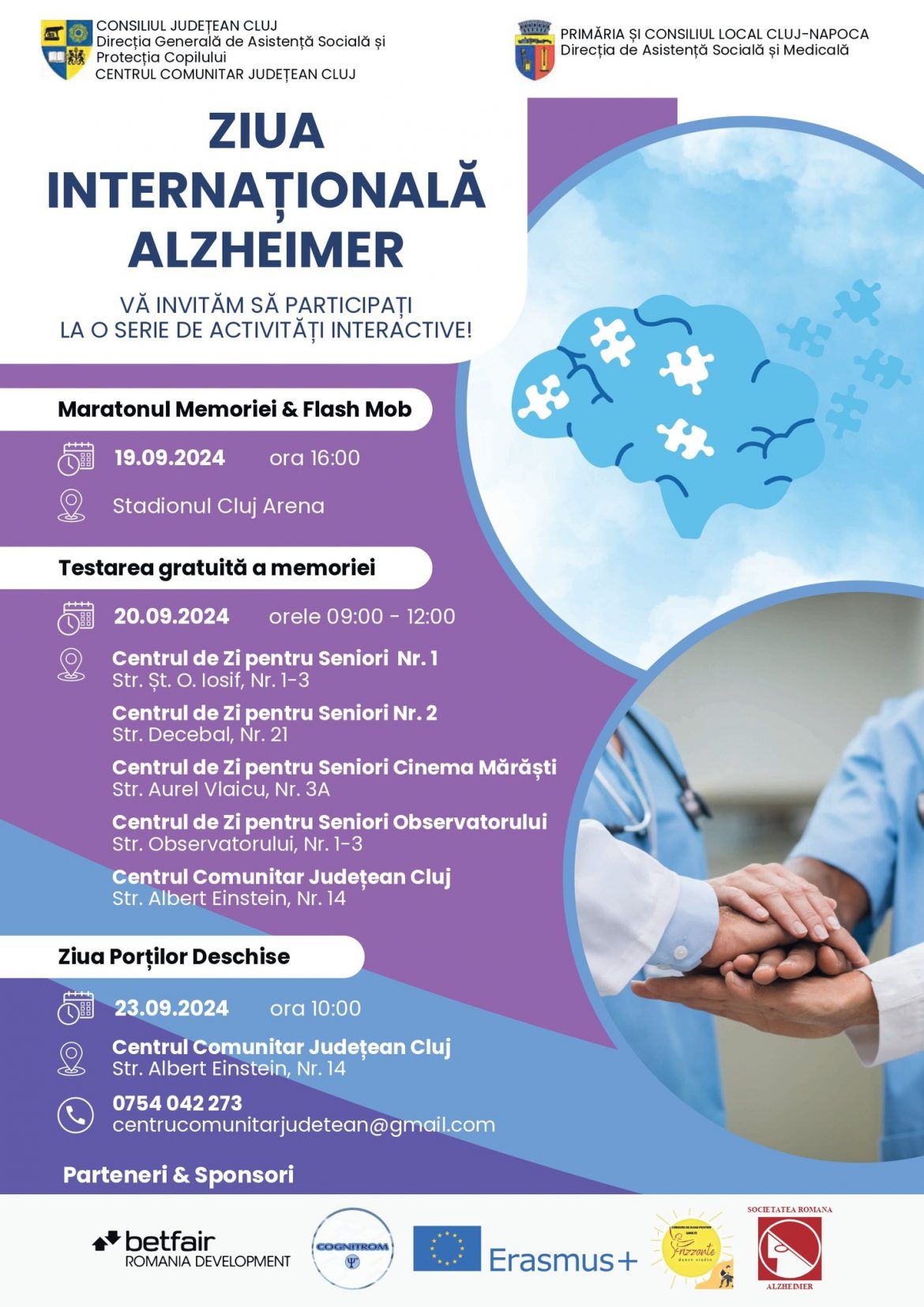Consiliul Județean Cluj, prin Direcția Generală de Asistență Socială și Protecția Copilului (D.G.A.S.P.C.) Cluj, în colaborare cu Primăria și Consiliul Local Cluj-Napoca, prin Direcția de Asistență Socială și Medicală, organizează o serie de evenimente pentru a marca „Ziua Internațională Alzheimer”.